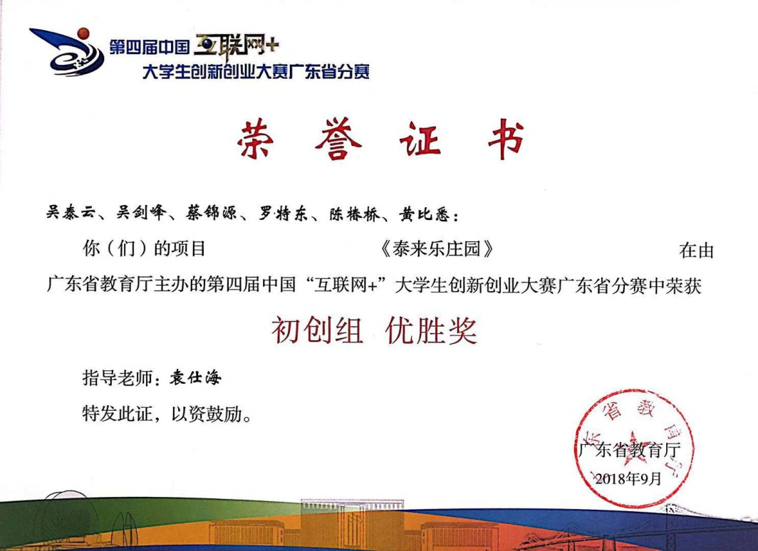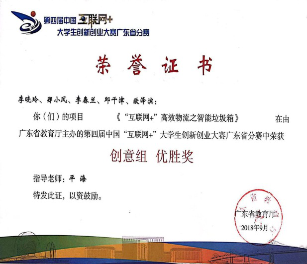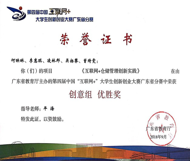 williamhill中国官网《泰来乐庄园》、《互联网+仓储管理创新实践》、《“互联网+”高效物流之智能垃圾箱》3个项目在2018年参加由广东省教育厅主办,吉林大学珠海学院承办的第四届中国“互联网+”大学生创新创业大赛广东省分赛中荣获“优胜奖”。