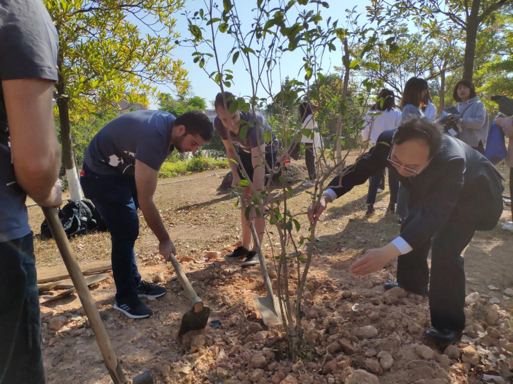 2019年12月12日,EachFuture机构广州办公室一行五人以及美方机构Greenheart代表一行六人来访我校,并进行了公益植树活动。我校副校长钟森文教授、国际交流与合作处处长王文忠等热情接待了来访的代表。