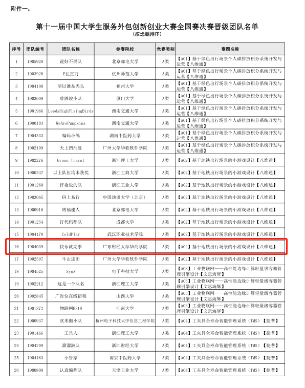 近日,第十一届中国大学生服务外包创新创业大赛组委会公布全国赛决赛晋级及三等奖获奖名单公告,我校有两支队伍再创佳绩,“快乐就完事”成功晋级全国总决赛角逐一、二等奖,“今晚不熬夜1”队获得全国赛三等奖。