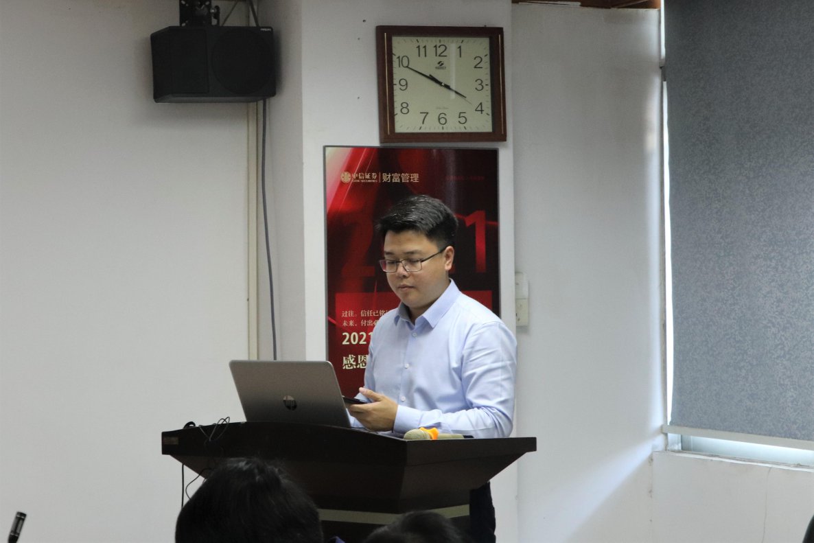 陈子毅先生向老师和同学们介绍了中信证券的发展历程、业务体系、远景、人才需求、用人机制等,他表示中信证券公司是一家从事证券代理买卖、证券的代保管等业务的综合类证券公司,是国内的头部券商,有着完整的工作体系,产品线丰富,一直保持着行业内龙头企业的地位。