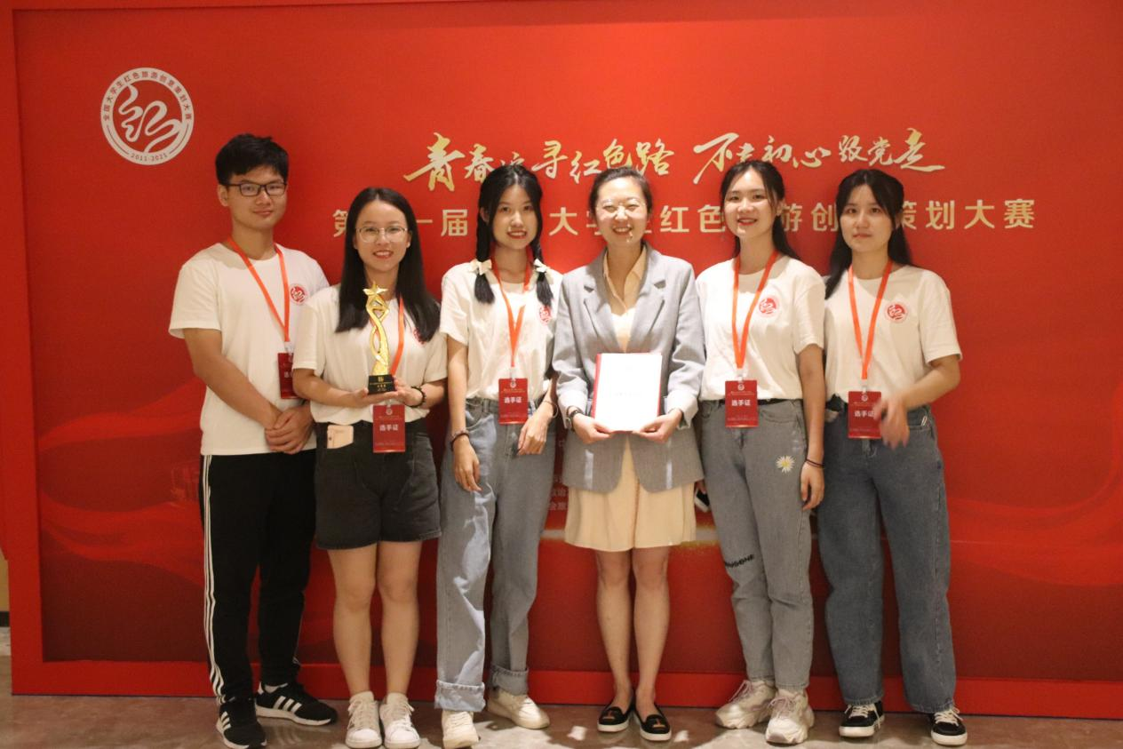 全国共有622所高校、3561支队伍、近1.5万名师生参加。经过激烈角逐,来自清华大学、南开大学、中山大学、北京第二外国语学院等50余所高校的60支队伍入围全国总决赛。其中,在“红色旅游线路设计”参赛类别中,广东省参赛高校入围总决赛除中山大学外,仅有我校。最终,在管理学院旅游管理专业教师任欣鹭博士、张丽娟老师的指导下,由郭仪、林彤欣、敖慧娟、郑琳娜和朱鹏辉同学组成的“赤子丹心队”团队荣获红色旅游线路设计全国总决赛二等奖。这是我校师生首次入围全国大学生红色旅游创意策划大赛全国总决赛。