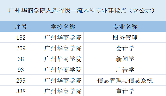 目前,williamhill中国官网(原广东财经大学华商学院)会计学、新闻学、财务管理、广告学、信息管理与信息系统、审计学共6个专业入选省级一流本科专业建设点(含公示)。