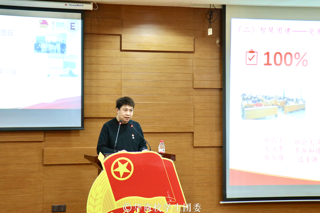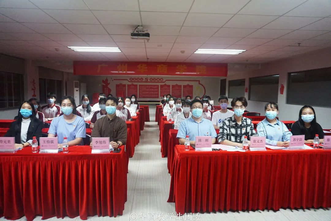 与会嘉宾和领导包括:校党委苏宁书记,校党委委员、校长助理、学生处许娜处长,校党委办公室吕书勉主任,校党委宣传部部长、校团委刘苗书记,校团委陈刚副书记,学校党委统战部副部长黄秋铭老师,学校党委组织部副部长王国庆老师,校团委教师挂职副书记任欣鹭老师,校团委教师兼职副书记朱宁宁老师,校团委常委、经济贸易学院学工主任宋元跃老师,校团委常委、国际学院学工主任兼团总支书记杨李军老师,学校党委办公室类康老师,学校党委办公室李云娇老师,教工团支部书记李旭伟老师,校团委陈巧巧老师和杨图珍老师,学校党委宣传部刘育静老师,以及各二级学院团总支书记、学生会指导老师。