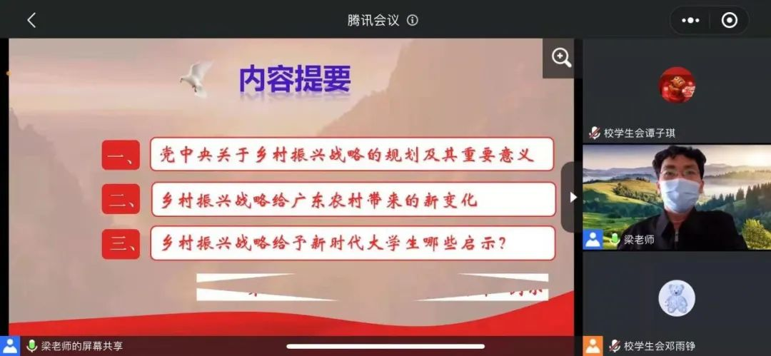 梁老师强调,我们要:第一,深刻理解“三农”工作方向。贯彻落实乡村振兴战略这一举措是全面建设现代化国家新进程的必然选择,是党为人民服务这一根本宗旨的重要体现。对于乡村振兴战略,党和国家进行了具体筹划:一是聚焦产业促进乡村发展;二是扎实稳妥推进乡村建设;三是突出实效改进乡村治理;四是加大政策保障和体制机制创新力度。第二,要准确把握“三农”发展成效。实施乡村振兴战略,是以习近平同志为核心的党中央作出的重大决策部署,是全面建设社会主义现代化国家的重大历史任务,也是新时代做好“三农”工作的总抓手,党的十八大以来,广东省委、省政府把实施乡村振兴战略纳入全省“1+1+9”工作部署,举全省之力全面推进乡村振兴。五年来,广东的农业农村发展取得了历史性成就,脱贫攻坚全面胜利,乡村产业加速发展,广东省从基础建设、科技生产、就业帮扶等多个维度建设农村多元化,乡村面貌发生历史性转变,广东向党和人民交出一份乡村建设的高质量答卷。第三,努力讲好“三农”中国故事。随着农业农村优先发展导向的确立,社会各界对于“三农”的关注度在逐步提升,但是由于农业农村的弱质弱势,“三农”声音在整个舆论场域还比较弱小,没有形成很大的声势。我们要在纷繁复杂的舆论场不断叫响农声,不遗余力地向全社会宣传“三农”、展示“三农”、礼赞“三农”。讲好“三农”故事,赋能乡村振兴!