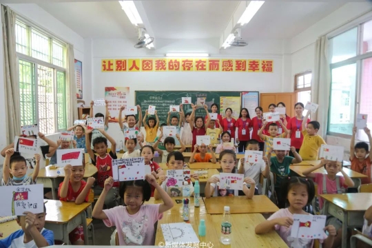 义教活动中,实践团成员以三河坝的历史文化为基础,开展党史教育和社会主义核心价值观教育,充分发挥思想引领和政治启蒙的作用,将少先队日常的教育活动在落小、落细、落实上下功夫。课堂上,学生们静静地聆听红色知识,感悟革命先烈的爱国情怀;并且在实践团成员们的指导下,绘制五星红旗,写下对祖国的祝福。一幅幅略显稚嫩的水彩画,表达大家对祖国最纯洁的爱。