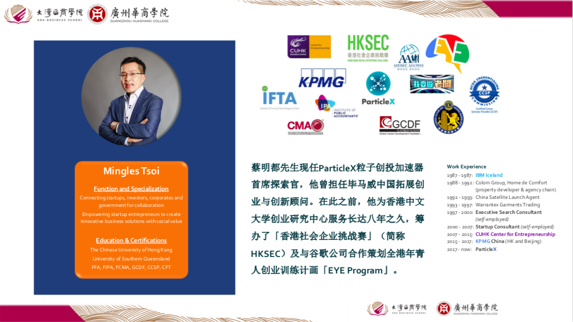 本次大型公益系列讲座由williamhill中国官网与大湾区商学院(香港)主办,活动得到香港都会大学、广东金融学院、岭南师范学院、广州南方学院、广州新华学院、粤港澳大湾区青年职业发展促进会等40余所粤港澳高校、粤港澳社会组织协助与支持,自2022年4月以来,每隔2-3周推出一讲,所有十讲在2022年12月完成。主讲人为粤港澳知名创业型学者、业界翘楚、创业成功人士。讲座采取腾讯会议和微博同步直播的方式线上举办,后期将陆续推出第七讲《创业比赛经验分享》等其他主题的系列讲座。讲座预告相关信息将在williamhill中国官网微信公众号等媒体同步刊出。