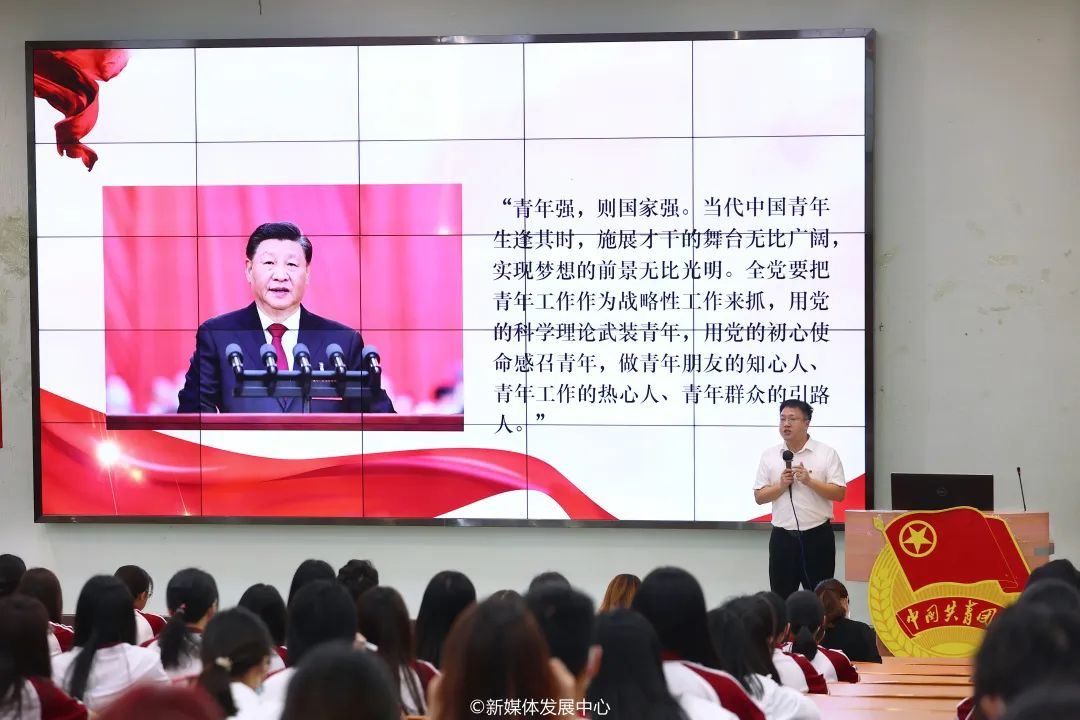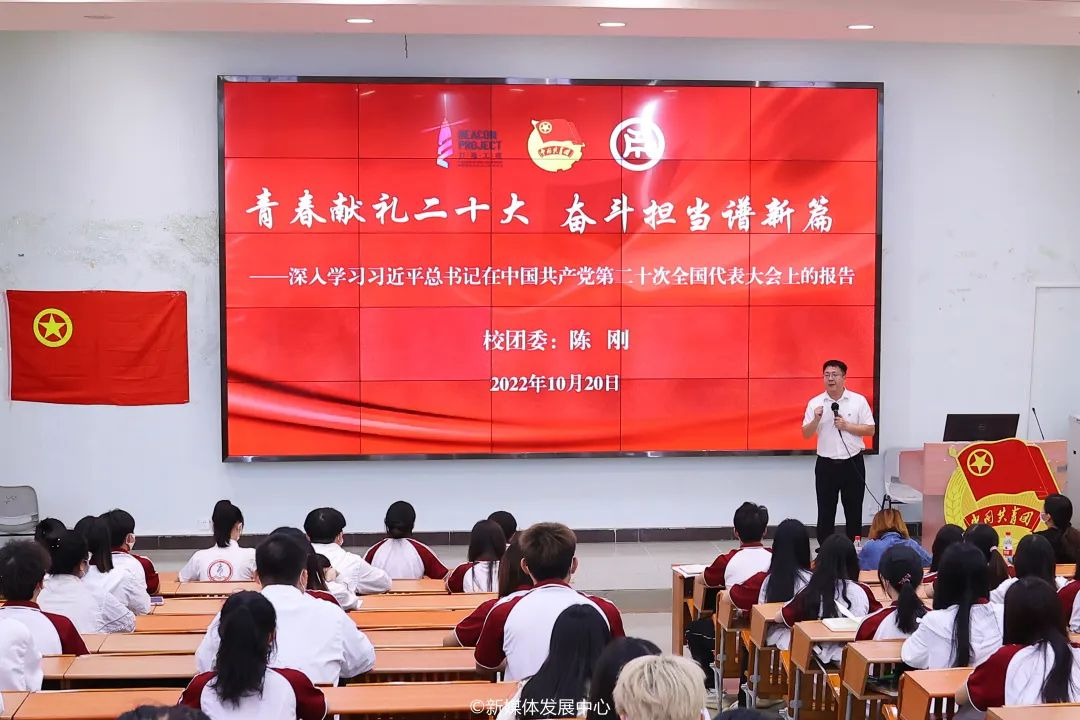 校团委书记陈刚老师围绕党的二十大会议主题、十年来党和人民事业具有深远意义的三件大事、“牢牢把握五个重大原则”、“五个必由之路”等党的二十大报告精神,激励师生们积极弘扬伟大的建党精神,发扬斗争精神。面对新时代不断变化的形势,我们要时刻牢记“三个务必”,务必不忘初心、牢记使命,务必谦虚谨慎、艰苦奋斗,务必敢于斗争、善于斗争。学校共青团将把青年工作放在战略性地位,学校各级团干部要做青年的知心朋友,青年工作的热心人以及青年工作的领路人。