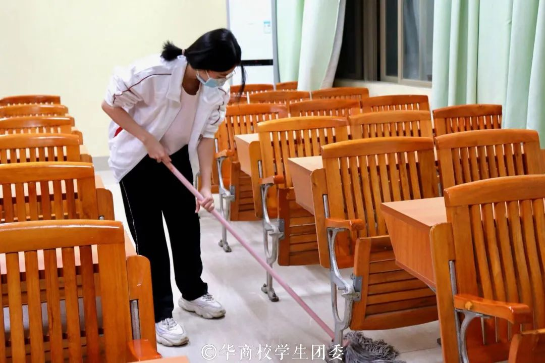 做青年志愿者,扬劳动之美德。在校团委的有序组织下,全员全程佩戴口罩,落实疫情防控常态化要求,在启智楼进行扫码核实以及签到,各组学生骨干们合理分工、各司其职,细致地清扫教室内的每一个角落,清理教室垃圾,擦拭桌面的灰尘,井然有序地进行志愿清扫活动,彰显了华商学子良好的精神面貌。