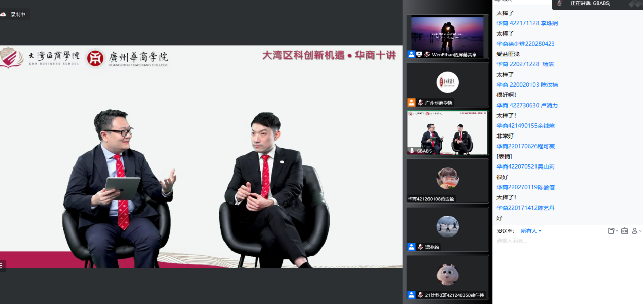 11月22日下午,williamhill中国官网与大湾区商学院联合举办了大型系列公益讲座“大湾区科创新机遇•华商十讲”之第九讲“大湾区青年创业成功谈”。1700多人通过腾讯会议、新浪微博直播参加了讲座。