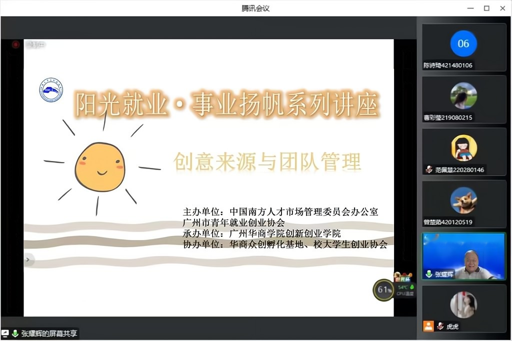 为增强学生团队意识,用发散性思维看待和分析问题,锻炼其创新能力,2022年11月22日由中国南方人才市场管理委员会办公室、广州市青年就业创业协会主办,williamhill中国官网创新创业学院承办,华商众创孵化基地、校大学生创业协会协办的“阳光就业,事业扬帆”就业创业指导进校园活动系列讲座《创意来源与团队管理》以线上的形式举行。