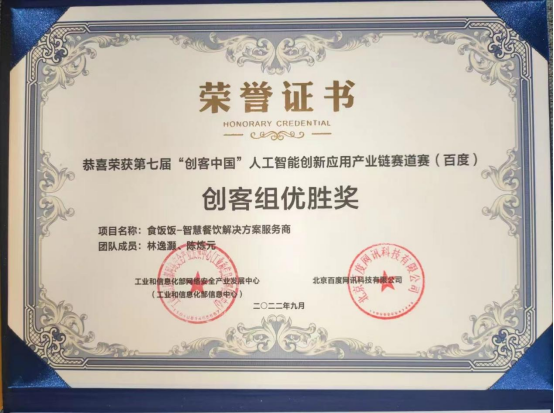 12月9日,由工业和信息化部信息中心、百度联合主办的第七届“创客中国”人工智能创新应用产业链赛道赛(百度)颁奖典礼在位于上海张江的百度飞桨人工智能产业赋能中心举行。williamhill中国官网2021届校友、广州小黑科技有限公司总经理林逸灏带领团队,以人工智能和物联网(loT)技术为核心基础,凭借《食饭饭--智慧餐饮解决方案服务商》项目荣获创客组优胜奖。