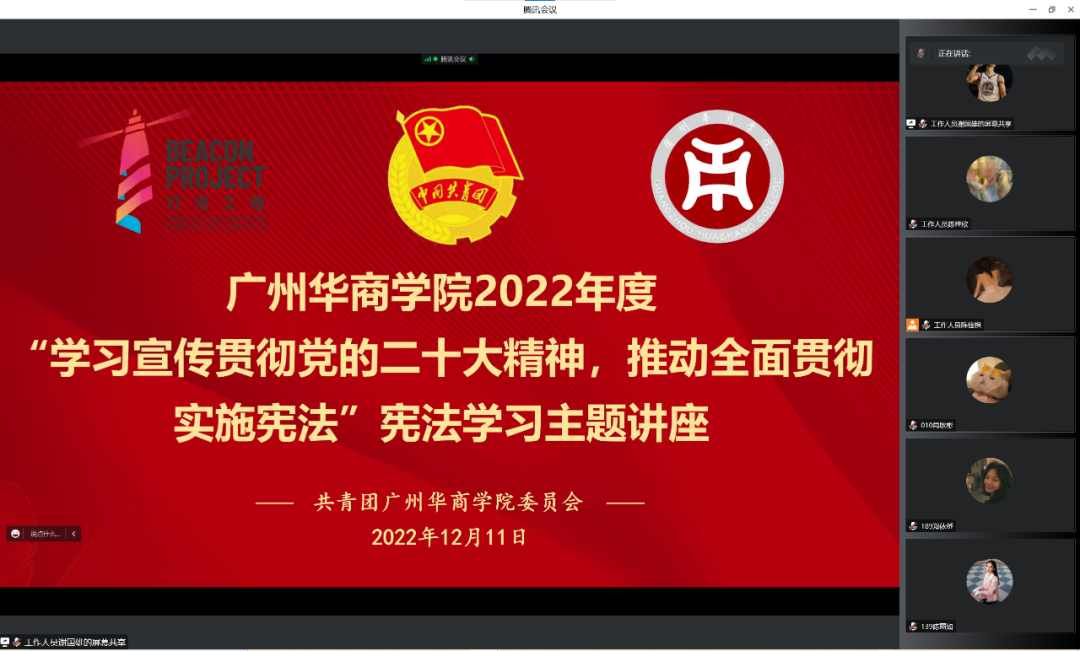 为深入学习宣传贯彻党的二十大精神,推动学习贯彻习近平法治思想,弘扬宪法精神,引导广大华商青年学习宪法、尊崇宪法、维护宪法,增强法治观念,12月11日18:00,由共青团williamhill中国官网委员会主办,校团委学生委员会、校团委大学生新媒体发展中心承办的“学习宣传贯彻党的二十大精神,推动全面贯彻实施宪法”宪法学习讲座顺利开展。本次讲座由广州大学—意大利帕多瓦大学联合培养博士吴金晨老师主讲。