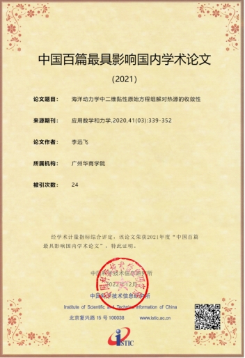近日,中国科学技术信息研究所在线召开了“中国科技论文统计结果发布会”,公布了2021年度“百种中国杰出学术期刊”、“中国百篇最具影响学术论文”及“领跑者 5000——中国精品科技期刊顶尖学术论文(F5000)”遴选结果。其中,我校李远飞教授2020年于《应用数学和力学》期刊上发表的题为《海洋动力学中二维黏性原始方程组解对热源的收敛性》的论文成功入选2021年“中国百篇最具影响学术论文”。我校李远飞教授2020年于《应用数学和力学》期刊上发表的题为《在一个半无穷柱体上的非标准Stokes流体方程的二择一问题》的论文成功入选“领跑者5000—中国精品科技期刊顶尖学术论文”。