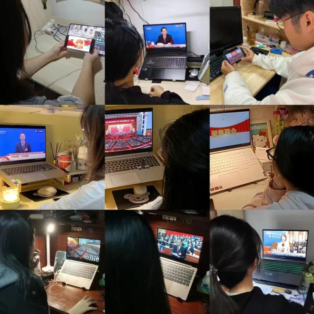 广大华商学子关注热议全国两会开幕。各校级学生组织、二级学院团学组织动员团员青年们通过多种方式,积极参与到两会精神学习之中,学习领悟政府工作报告内容。