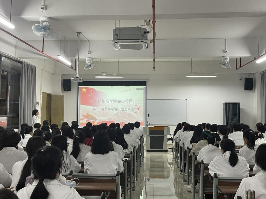 四会校区党委书记王卫平副校长在四会校区8号楼109教室为师生代表讲授2023年春季学期“思政第一课”,6号楼405教室分会场同步收听收看。