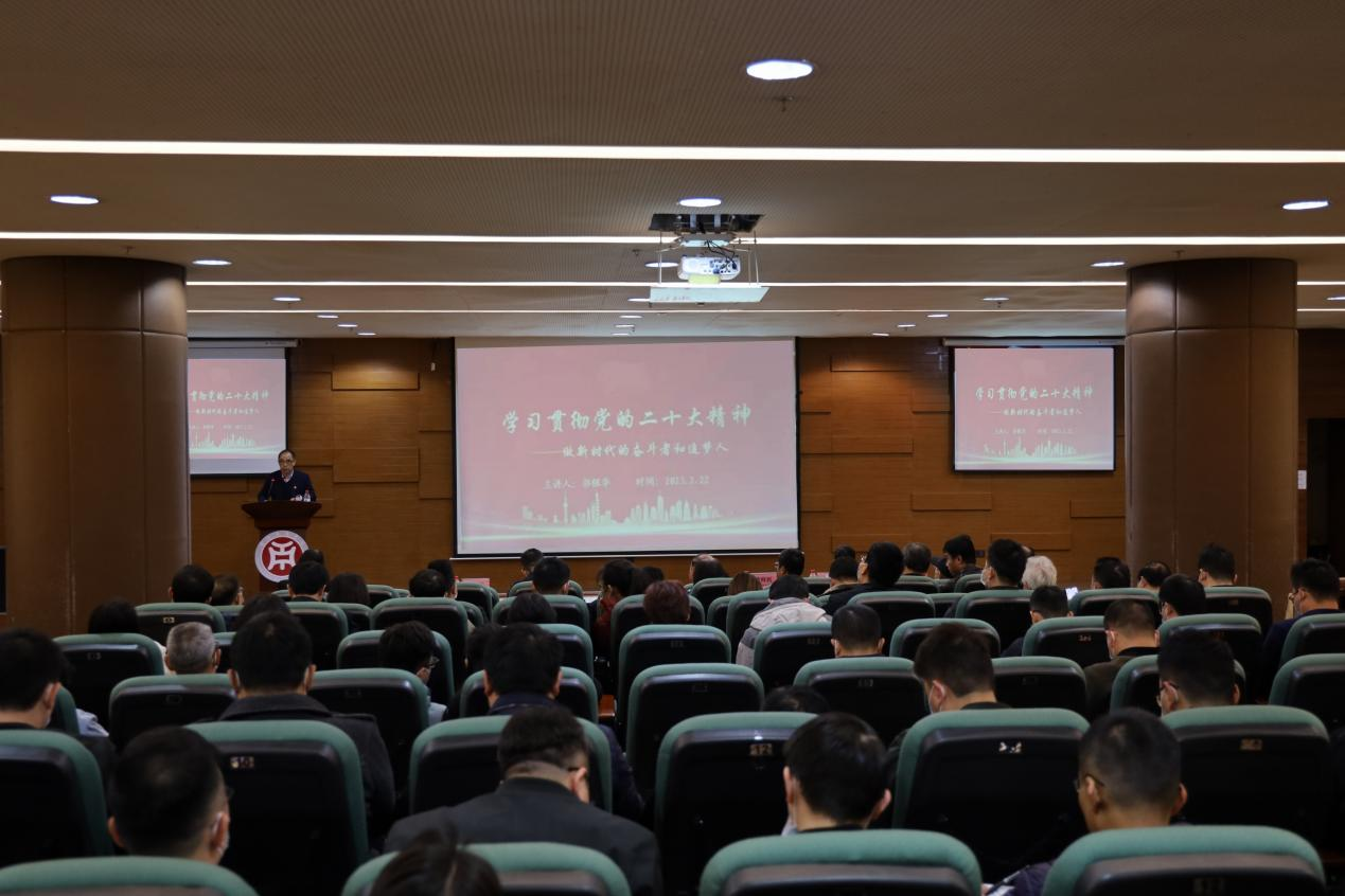 郭银华执行校长在图书馆报告厅为学校党政领导班子、中层干部、学生党员代表讲授开学思政第一课。郭校长紧扣党的二十大报告,以《学习贯彻党的二十大精神,做新时代的奋斗者和追梦人》为题,从过去五年的工作和新时代十年的伟大变革、开辟马克思主义中国化时代化新境界、以中国式现代化推进中华民族伟大复兴、全面建设社会主义现代化国家的目标任务、以伟大自我革命引领伟大社会革命、牢牢把握团结奋斗的时代要求等六个方面,对党的二十大精神进行了深刻全面的解析。