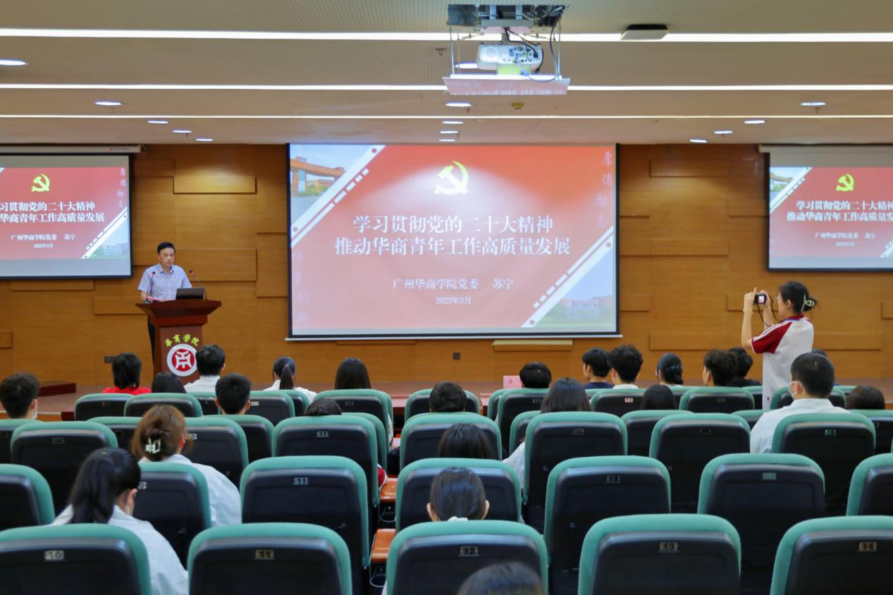 苏宁书记以《学习贯彻党的二十大精神,推动华商青年工作高质量发展》为主题,从“全面系统学习贯彻党的二十大精神,更好凝聚思想共识、激发奋进力量”“传达学习广东省高质量发展大会精神,强化党建引领,以高质量党建推动学校事业高质量发展”“以习近平总书记系列重要讲话精神为指引,践行四讲,推动华商青年工作高质量发展”三个方面展开授课。