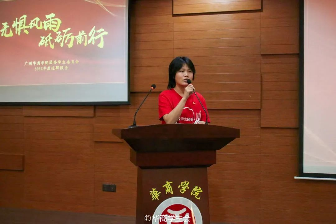 校学生团委常委团成员曾颖瑜作述职汇报。她提到,2022年是党的二十大召开之年也是中国共产主义青年团成立100周年,校学生团委在学校党委和学校团委的悉心指导以及全体学生骨干的共同努力下,坚持以党的二十大精神为指引,落实党对青年工作的重要要求,高扬理想旗帜,完善组织建设,开展共青团专题理论学习会、青马工程与团校学习班,切实为同学成长成才服务;统筹开展广东省“挑战杯”系列赛事,搭建“攀登计划”创新实践平台,组织开展2022年暑期“三下乡”社会实践活动,鼓励和引导青年坚定理想信念,谱写时代新篇章。