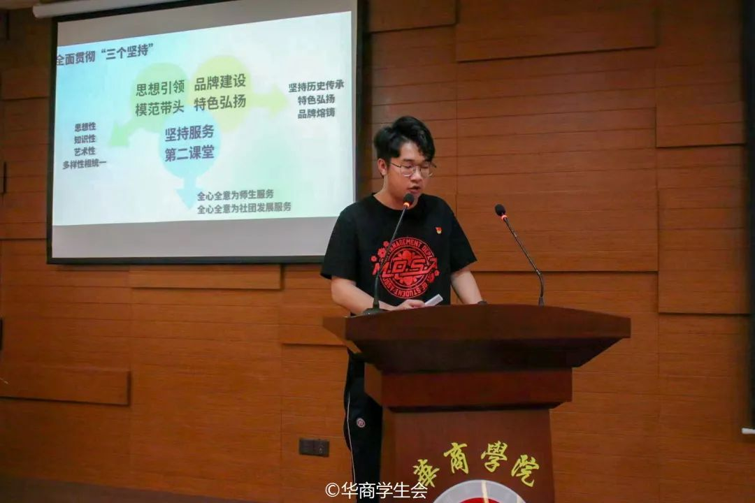 校团委大学生新媒体发展中心常委团成员何以立作述职汇报。新媒体发展中心紧跟时政热点,结合党史学习教育,深入学习党中央治国理政新理念新思想新战略,切实做好共青团思想政治宣传引领工作。打造以微信公众号为核心的新媒体平台阵地,通过网站、B站、微信视频号等平台辅助宣传,拓展青年舆论阵地;通过主题鲜明,贴近生活的原创作品,传递华商青年声音;通过毕业文创、街拍、街访等栏目拉进与华商师生的距离。校新媒体中心将不断完善组织管理体系,提升自身能力,继续当好“校园传声筒”。