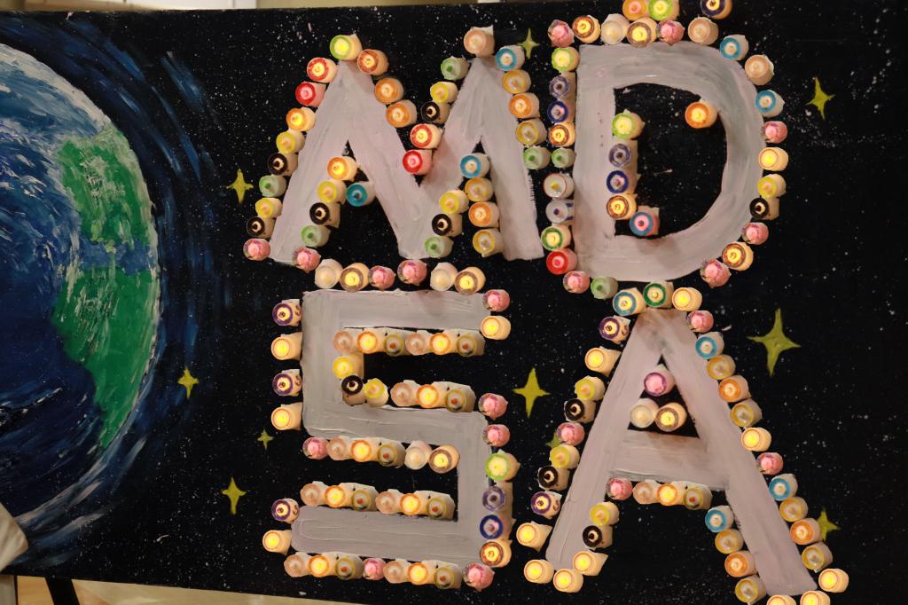 ——DIY蜡烛墙。华商学子充分发挥想象力和创造力参与diy蜡烛墙制作。他们用油画棒在素白的电子蜡烛上,上色后粘贴在提前准备好的展板上展示。