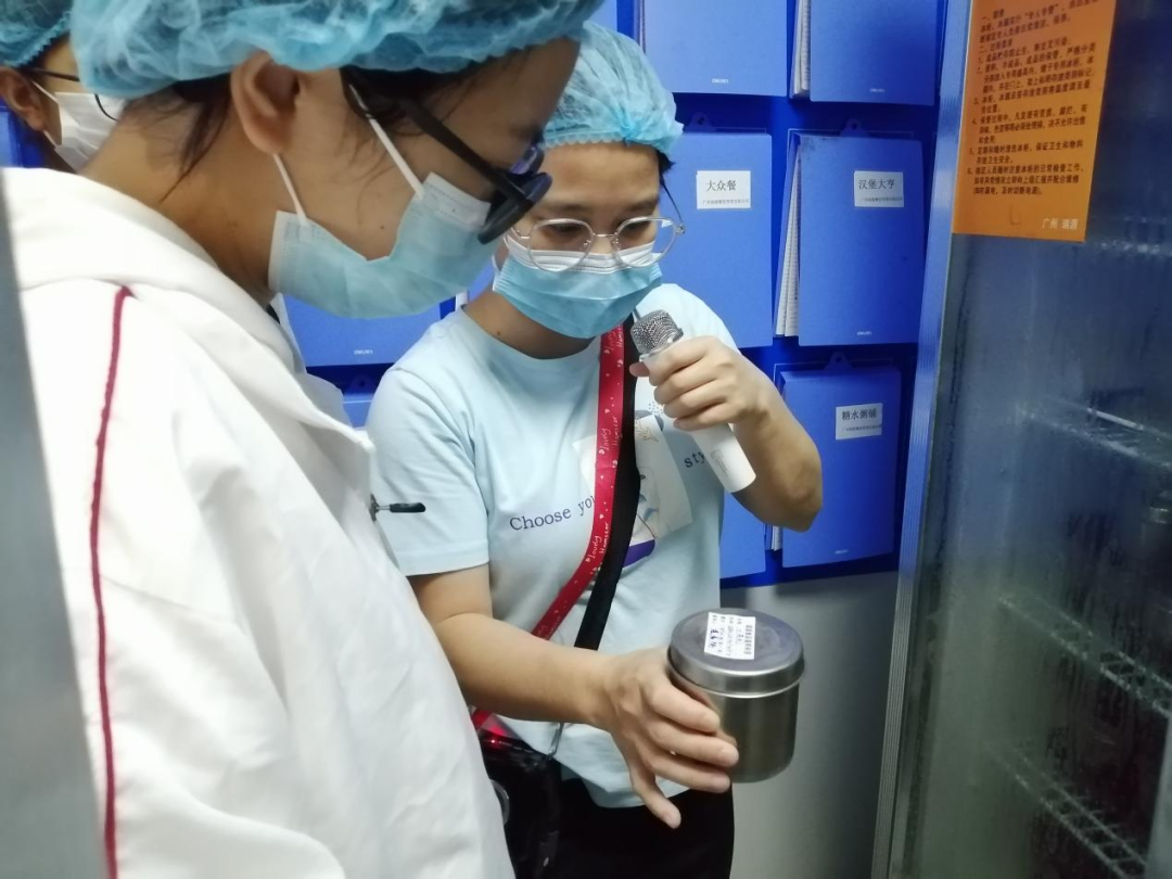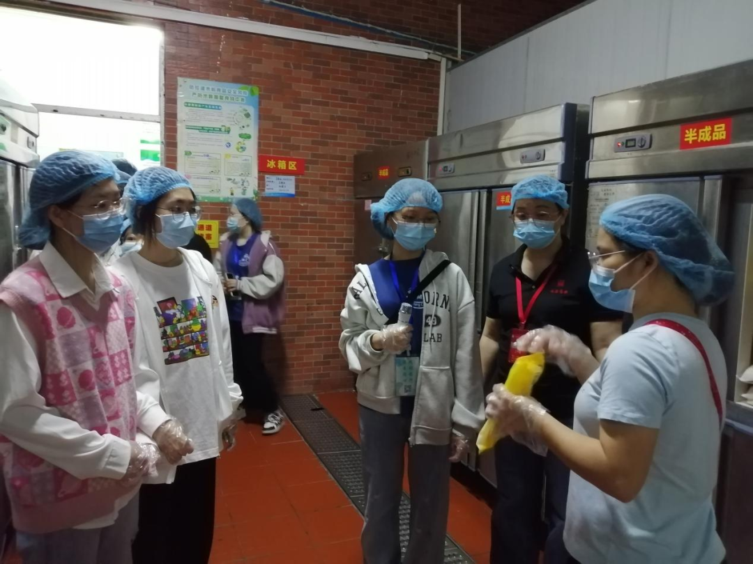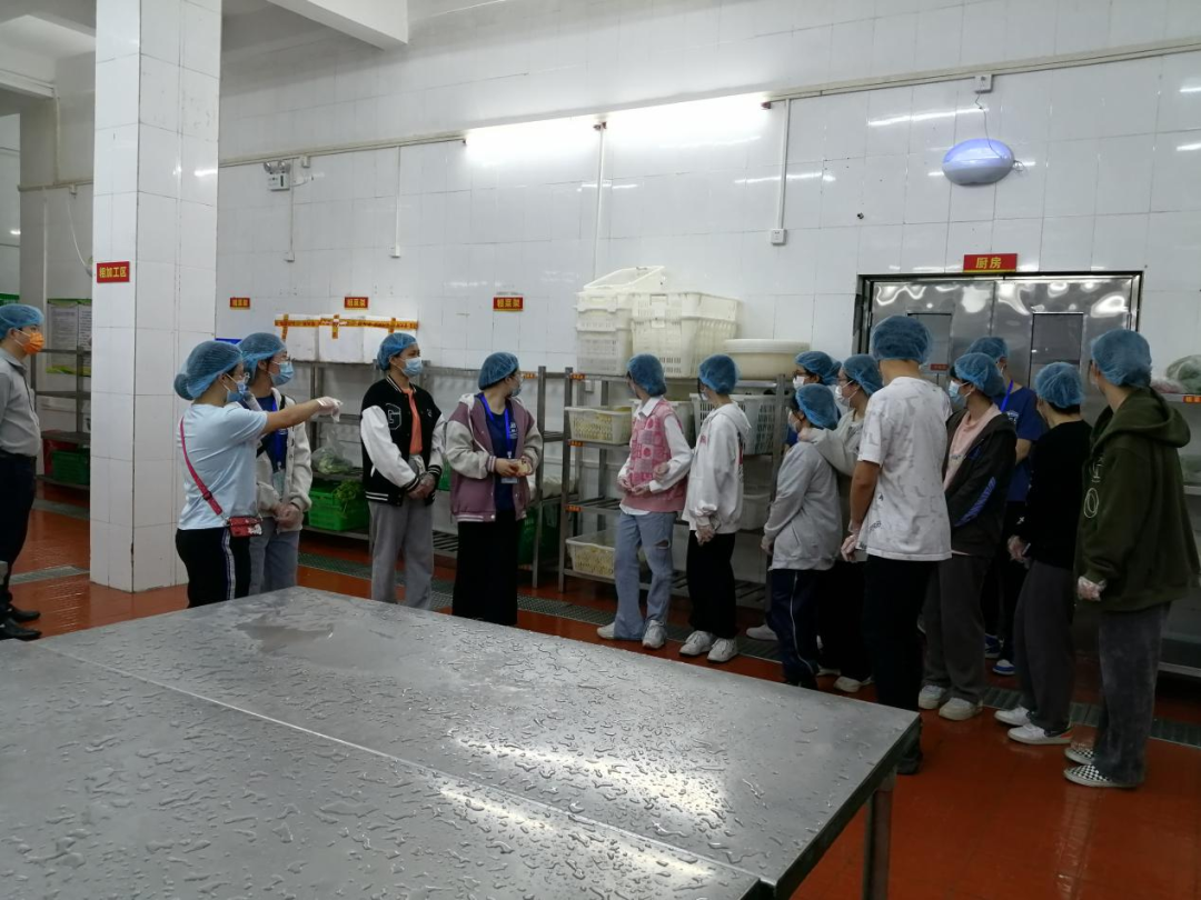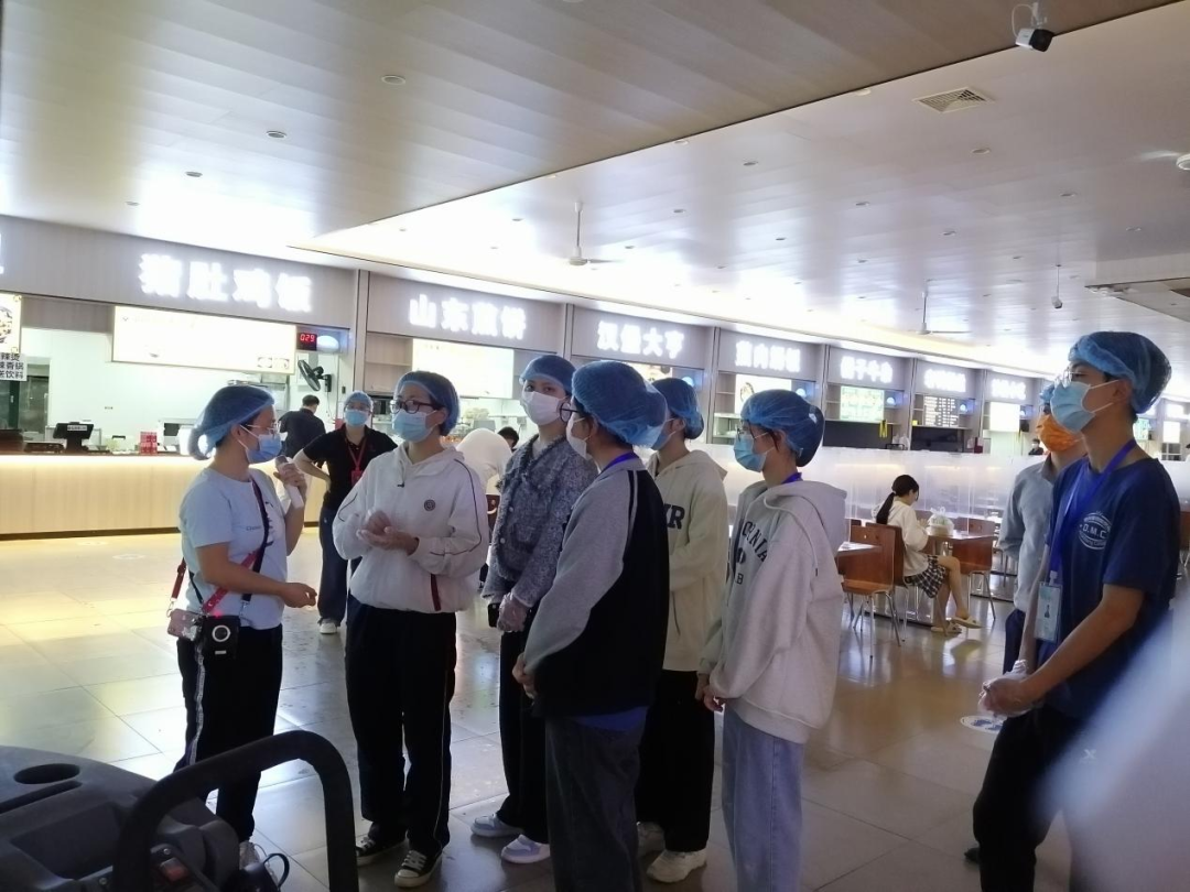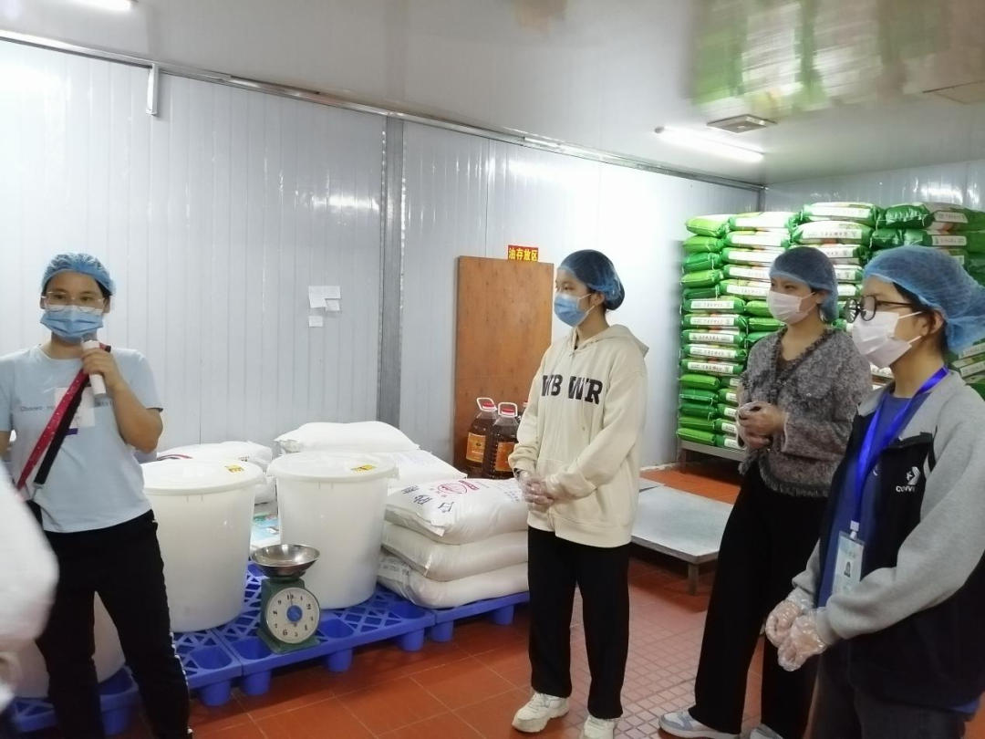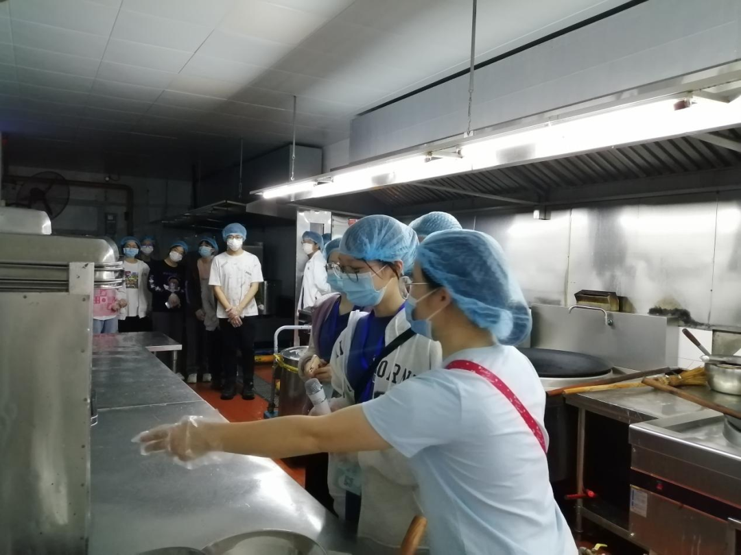 按照食堂的要求,学生代表们在食堂工作人员的带领下,戴上口罩和头套,走进第四食堂留样间、仓库、冷藏库、粗加间、烹煮间、洗消间、明厨亮灶等区域进行参观学习。
