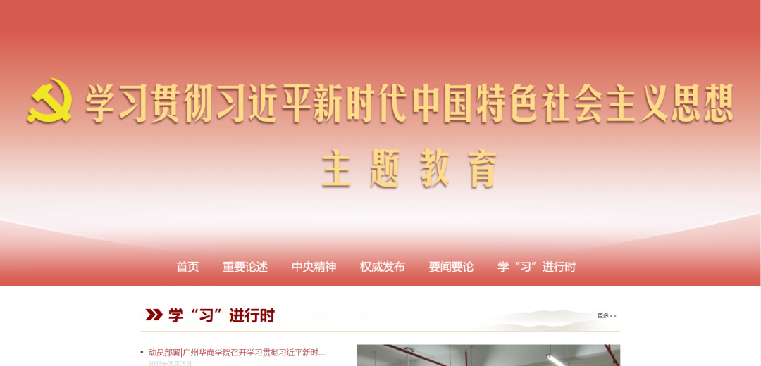 学校主题教育专题网站设有“重要论述”“中央精神”“权威发布”“要闻要论”“学‘习’进行时”等栏目,在学校官网主页设置入口链接。为全校师生跟进学习习近平新时代中国特色社会主义思想,及时了解学校主题教育开展情况提供信息平台。