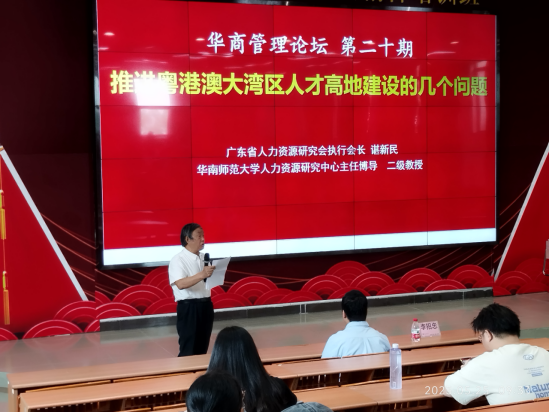 5月25日上午,广东省人力资源研究会执行会长、华南师范大学人力资源研究中心主任、博导、二级教授谌新民老师应邀来我校作题为《推进粤港澳大湾区人才高地建设的几个问题》的学术报告。管理学院院长李招忠教授、副院长秦陇一教授、院长助理廖珍杰副教授、院长助理袁仕海副教授及管理学院师生代表参加了此次讲座。