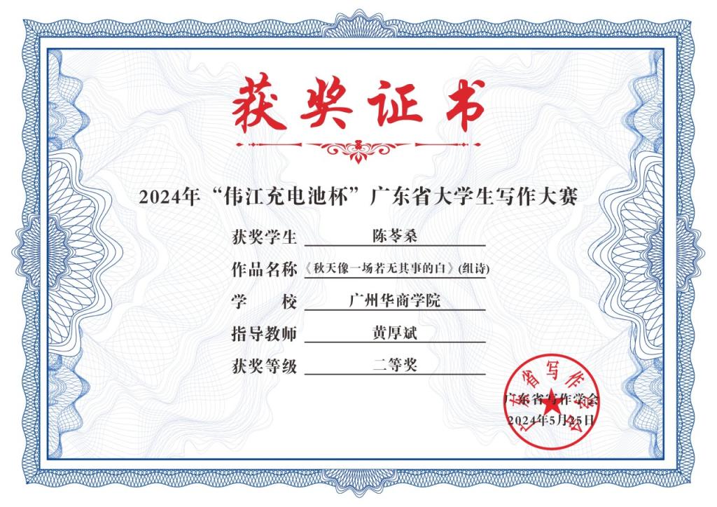 在我校学子对文学创作的长期坚持和各位指导老师的潜心研究、耐心教学下,我校也在本次大赛中取得优异成果,被授予“优秀组织单位”称号,荣获“广东省写作学会教学成果奖”二等奖。