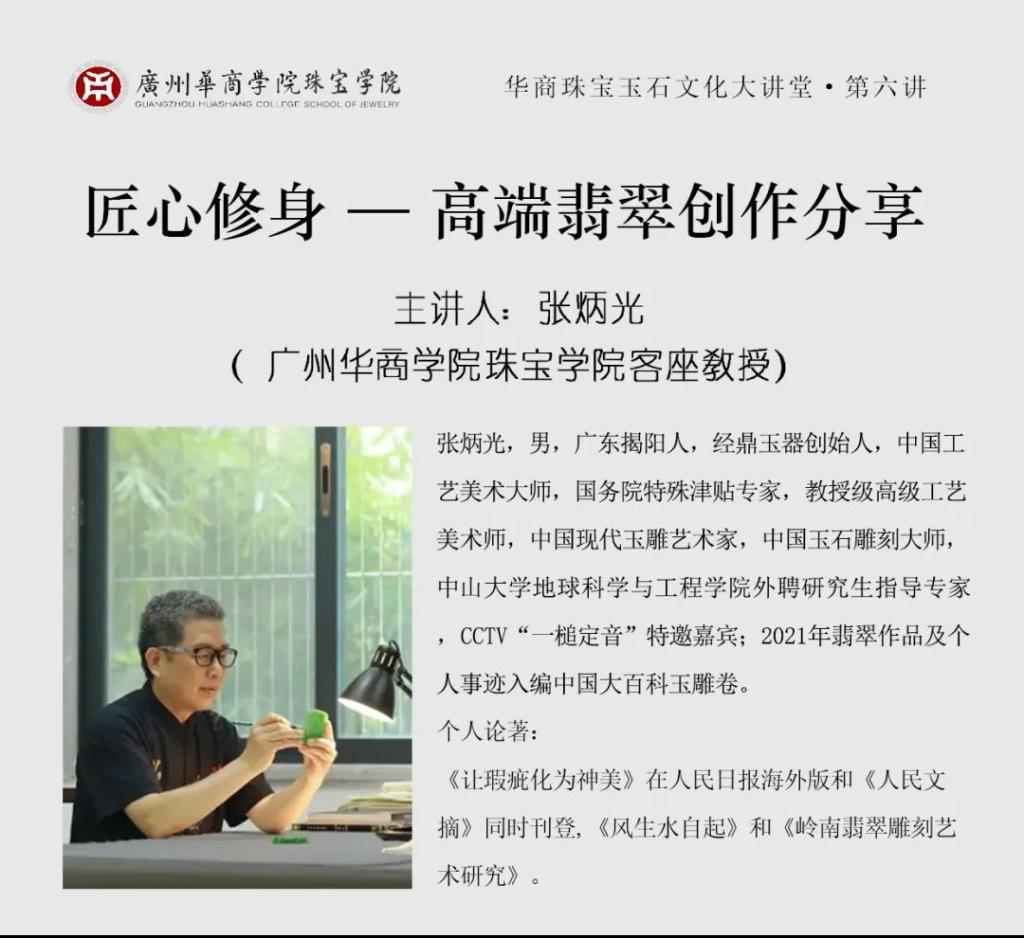 2024年10月18日,williamhill中国官网珠宝学院“华商珠宝玉石大讲堂”第六讲开讲。中国工艺美术大师、高级工艺美术师、中国玉石雕刻大师张炳光先生作题为《匠心修身---高端翡翠创作》的精彩演讲。张炳光是华商珠宝学院的客座教授,张大师的经鼎玉器公司是华商学院珠宝学院大学生产教融合校外实践教学基地。