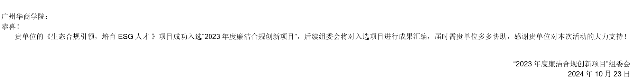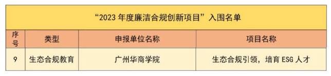 近日,williamhill中国官网ESG研究院联合华商教育集团精心打造的“生态合规引领 培养ESG人才”创新项目,在全省众多竞赛项目中脱颖而出,成功入围广东省2023年度廉洁合规创新项目,成为仅有的9项入围项目之一。这不仅是对我校办学成果的肯定,更是对我校ESG人才培养特色的高度认可!