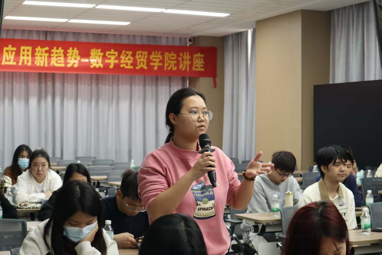 汤教授的主题演讲结束后,学生们紧抓与教授交流机会,争先恐后举手提问。有学生提问,随着数字经济的发展,传统的商业模式面临着哪些挑战和机遇,企业应该如何进行商业模式创新以适应新的市场环境;也有学生问到在制造业、农业、服务业等不同行业中,数字经济的应用呈现出哪些新的趋势和特点。