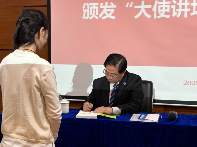 本场讲坛还特别安排了签名赠书环节。何昌垂院士结合多年科技和外交工作经验撰写了多部与粮食安全、国际事务、国际组织的专著,他非常热情而认真地为现场要求签名的同学在书籍写上鼓励的话语。