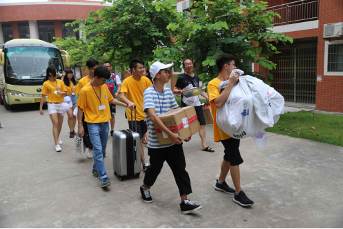 满怀喜悦且充满好奇而前来报到的新生和家长在踏入华商校门的那一刻便感受到了我系师生对他们的热情欢迎和关心。校门口身着黄色短T的“小黄人”志愿者和白色校服、粉色团服的工作人员热情积极地帮助新生和家长搬行李物品,将他们引领至图书馆新生报到处,完成入学注册。宿舍楼下的志愿者看到提着行李而来的学生和家长便会主动向前伸出友谊之手,共同帮助新生入住宿舍。助班团热情地向新生们讲解入学须知,介绍学校概况、专业设置、附近交通,提醒他们注意防火、防盗、防骗,提高他们的安全意识。在各个岗位负责的辅导员积极处理出现的突发问题,维持各个岗位的迎新秩序,整个迎新现场一片热闹景象却井然有序。