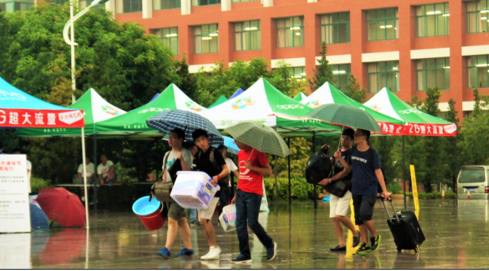 虽然报道期间秋雨连绵不断,为迎新工作增加了难度,但丝毫不影响大家的工作热情,忙碌的现场秩序井然。学生志愿者在校园内穿梭,为新生家长指引方向和搬运行李,同时也耐心地解答新生及家长们的各种问题。