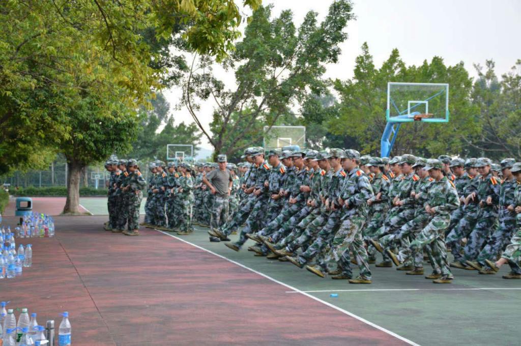 在训练开始前,教官对新生们的军服着装进行一番教育与调整。每位新生都以一副饱满的精神状态和认真至极的态度来应对严格的军事训练:站军姿——新生们必须站在原地不动20分钟以上;原地踏步,敬礼,齐步走等,都是军训中必不可少的科目。