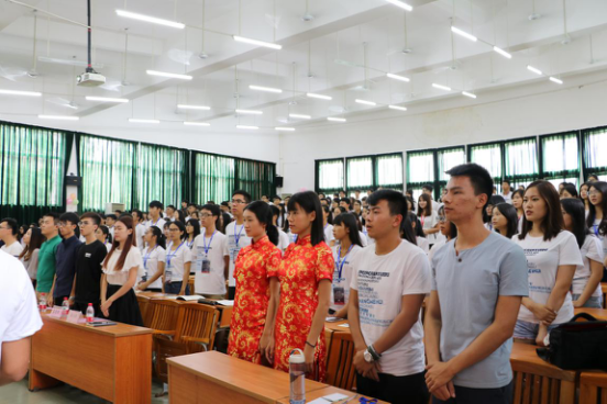 会议由唱团歌拉开了帷幕,全体老师、部长、干事起立,面向团旗,奏唱团歌。一字一声铿锵有力,大家用饱满的热情开始了此次培训大会。