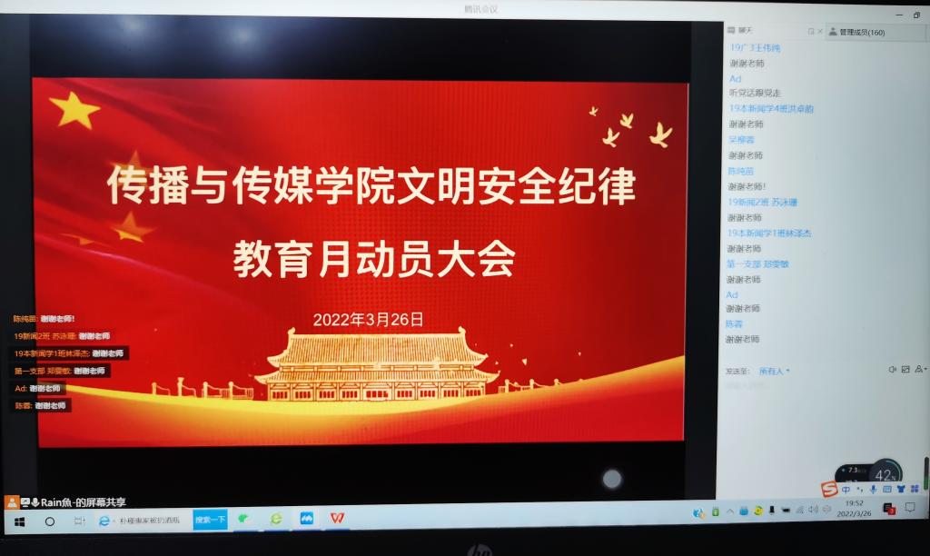 为统一思想、明确方向,传播与传媒学院在3月26日组织开展文明安全纪律教育月活动动员,参加本次会议的有传播与传媒学院党委副书记、学工办副主任谢清明,学院全体辅导员,学院全体学生党员(预备党员)、各学生组织主要干部、班级干部代表,总计近300人与会。受疫情防控安全影响,本次会议以线上的方式进行。