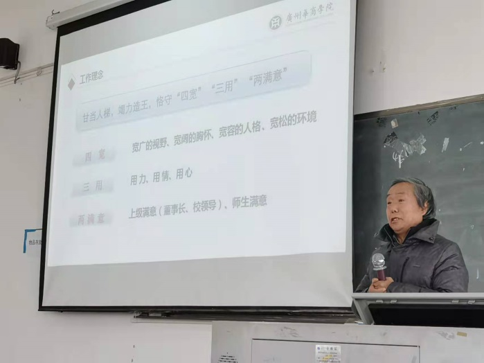接着,李院长详细阐述了学院的工作理念、工作思路、工作措施和工作困难。学院领导班子的工作理念是甘当人梯,竭力造王,恪守“四宽”、“三用”、“两满意”原则。每个班子成员必须有宽广的视野、宽阔的胸怀、宽容的人格,努力营造一个宽松的环境,凝聚管院全体同仁用力、用情、用心工作,力争做到学院工作让董事长、校领导满意和师生满意,坚持令在华商,策出院方,事落系上的管理原则,找准学院学科专业发展定位,内聚合力,外拓资源,人尽其才,物为人用,凸显华商应用型特色人才培养优势,争当广东乃至全国民办大学管理学科的排头兵和领头雁。