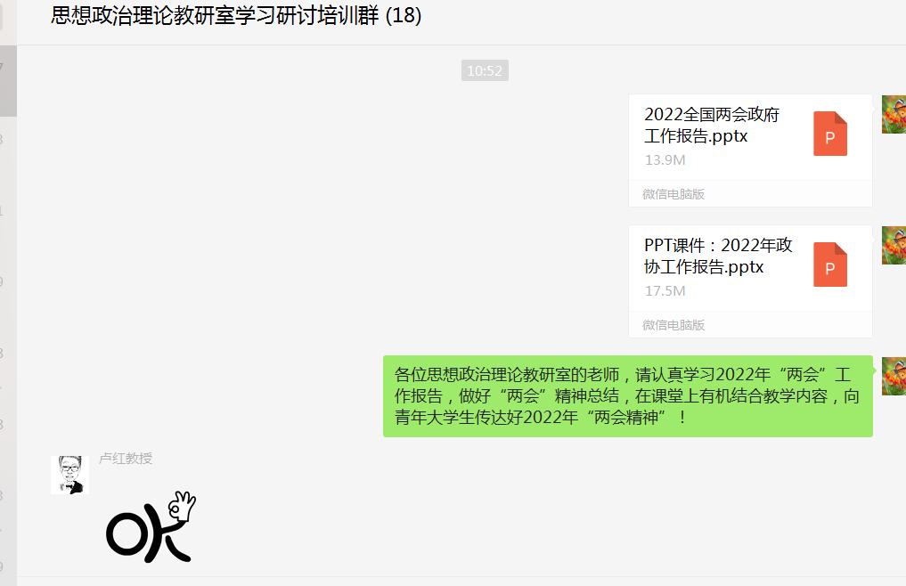 同时,通过思想政治理论教研室微信群分享了2022年十三届全国人大五次会议《政府工作报告》和全国政协十三届五次会议《全国政协常委会工作报告》解读PPT,号召本教研室教师认真学习,深刻领会“两会”精神,并在课堂上有机融入教学内容,向华商学子传达“两会”精神,引导学生及时关注当前形势,力求入脑、入心。