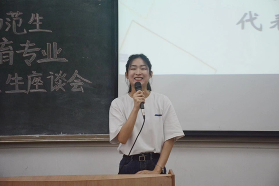 会议第二项内容:优秀毕业生代表、国家奖学金获得者周丹琪同学发言。周丹琪同学首先感谢国家的栽培,学校和学院领导的付出,老师们的谆谆教诲,以及同学们的鼓励。她回顾大学四年,自己付出了辛勤的汗水,以更高的标准要求自己,获得今天的成就是一项非常大的荣耀。同时她也表示昨天的荣耀已是过去,在未来她将会克服困难和挫折,继续奋勇前行。在最后,周同学还对师弟师妹们、老师们以及学校给予祝福。