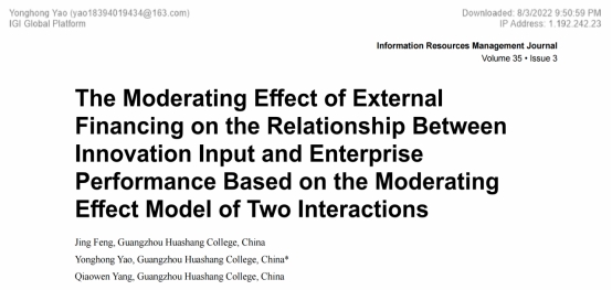 近日,会计学院青年教师冯婧(第一作者)、姚永红(通讯作者)、杨俏文合作发表了题为“The Moderating Effect of External Financing on the Relationship Between Innovation Input and Enterprise Performance Based on the Moderating Effect Model of Two Interactions”(外源融资对创新投入和企业绩效的影响研究——基于二次交互的调节效应模型)的论文。该论文发表于《Information Resources Management Journal》期刊,该期刊属于EI核心检索期刊。