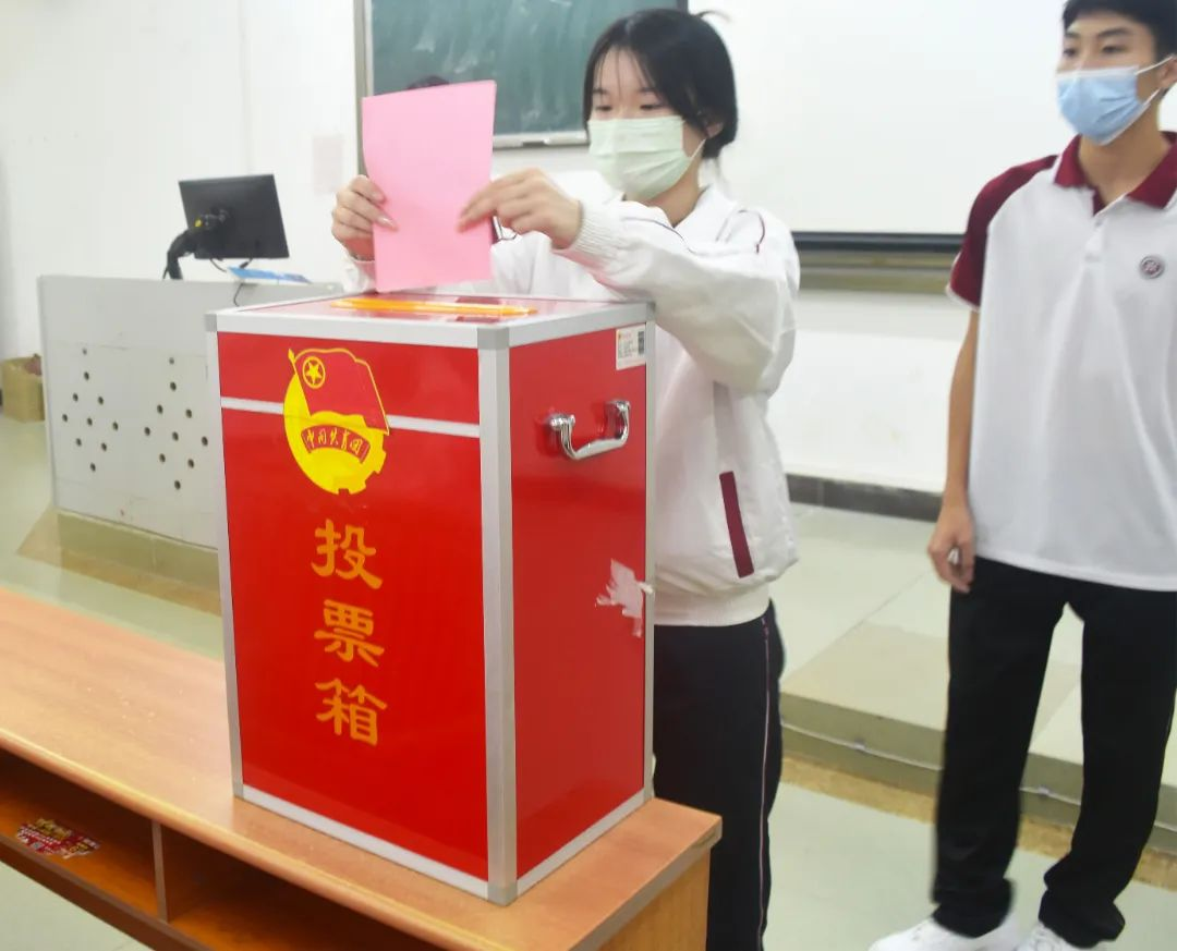 正式选举候选人。总监票人展示票箱密封情况以及选票袋密封情况并交给学生代表签名确认。总监票人、监票人、计票人为各位代表分发票券,各位代表按照说明填写票券。