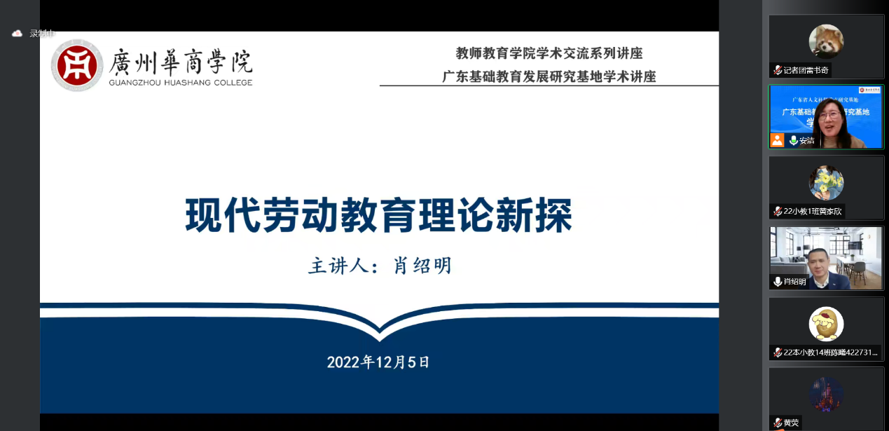 为深入探析新时代劳动教育的必要性和对儿童发展的意义,更好地帮助新时代青年教师理解劳动教育的深刻内涵,提高灵活地对儿童进行劳动教育的能力。教师教育学院于2022年12月5日16:30在线上开展“现代劳动教育理论新探”云讲座。本次讲座由广东省人文社会科学重点研究基地华南师范大学现代教育研究与开发中心主任肖绍明教授主讲,由教师教育学院安洁老师主持。