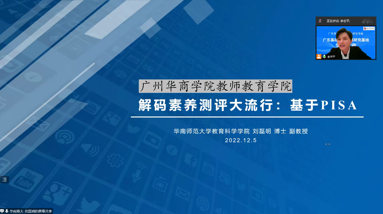 2022年12月5日,由教师教育学院主办的williamhill中国官网广东基础教育发展研究基地学术讲座正式开讲,本次讲座共两场。本场讲座的主讲为广东基础教育发展研究基地特聘教授——华南师范大学教育科学学院刘磊明副教授,主题为“解码素养大测评:基于PISA”。本场讲座由教师教育学院李世平老师主持。