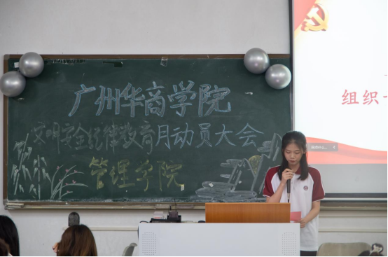 管理学院团委兼职副书记高涵作为组织代表发言。她呼吁同学们在文明纪律教育月的各项活动中认识到安全的重要性,养成良好的学习习惯和行为习惯,形成良好的班风、学风、作风,提高安全防范能力,有效地减少安全风险,齐心共创健康文明校园。