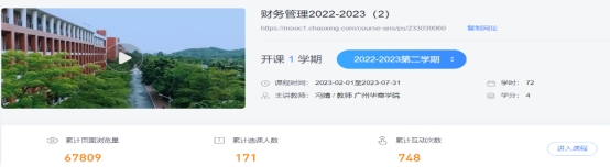 姚永红老师分析了本学期学习通的相关数据,本学期累计页面浏览量67809次,选课人数171人,互动次数748次。《财务管理》作为一流课程,目前处于维护期,后续主要是不断更新完善相关资料。