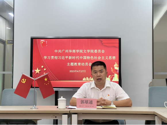 郭堪通副书记就扎实开展主题教育进行工作部署。他强调,各党支部要认真落实“第一议题”学习制度,坚持多思多想、学深悟透,并对《文学院党委主题教育工作方案》进行解读,要求学院党委委员和各党支部书记要深入领会主题教育的重大意义,准确把握目标要求,认真落实工作安排。