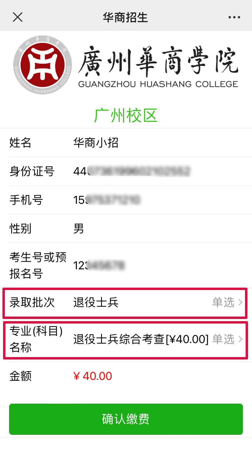 方式2. 进入“williamhill中国官网招生办公众号”,选择菜单栏“招生资讯”—“报考费”;进入缴费页面;准确填写个人信息,点击“下一步”;选择退役士兵批次及科目;核对相应金额,无误后点击“确认缴费”即可。