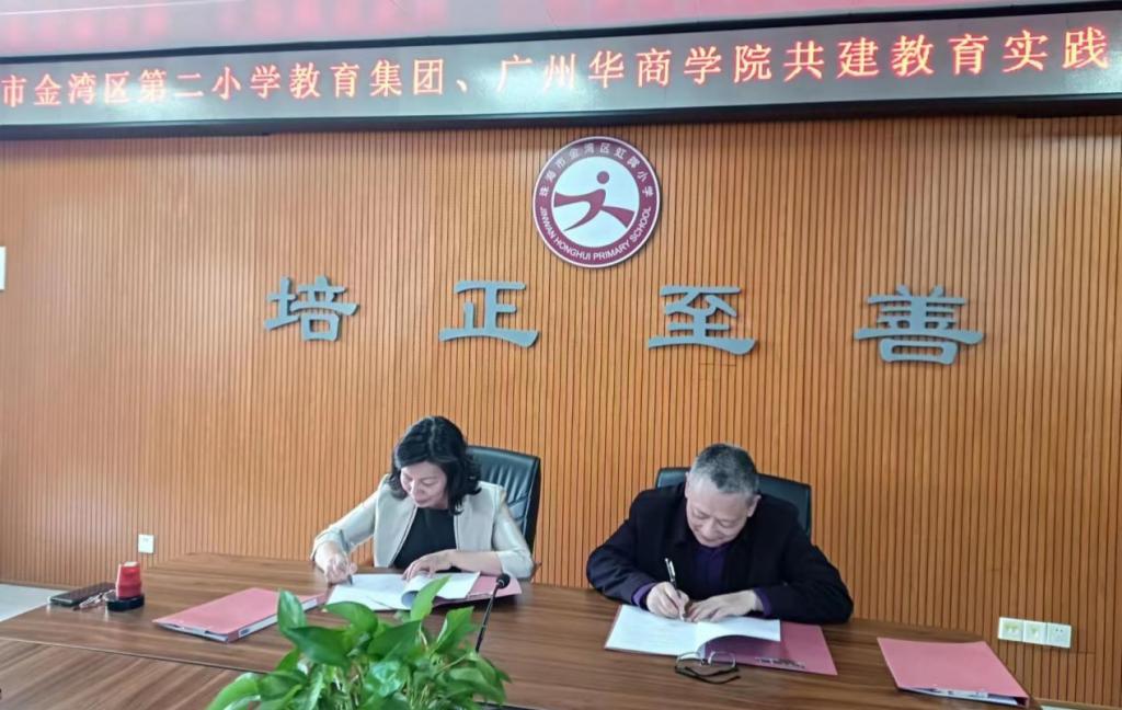 谭建生副院长和李彩芳校长在双方代表的见证下共同签署了共建教育实践基地的协议,谭建生副院长代表学院向珠海市金湾区第二小学教育集团授牌。